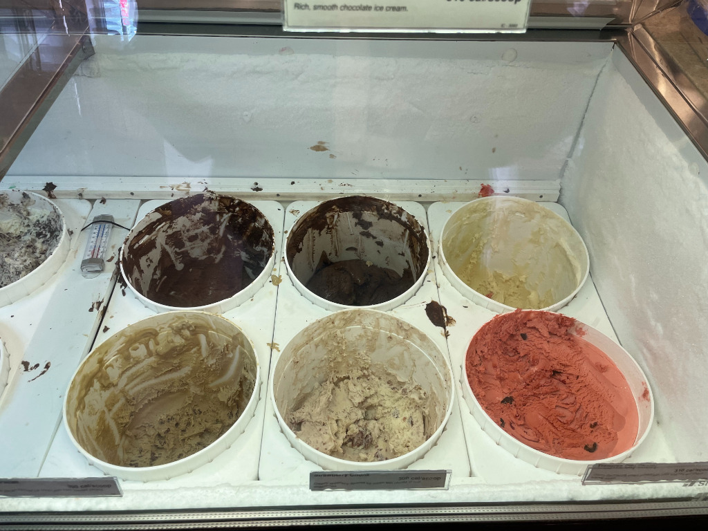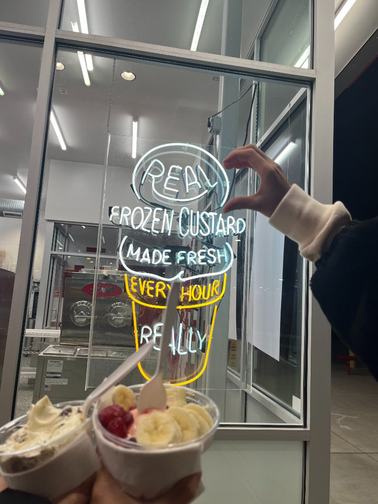 ここは私の寮から徒歩5分にあるアイス屋さんで、寮の外から見えます笑それぐらい近いのと私が好きなアイスが売っているので、1学期に3回は必ず行きます。ここは珍しいお店でダイニングがないのでドライブスルーか外で買うかの2択になります。