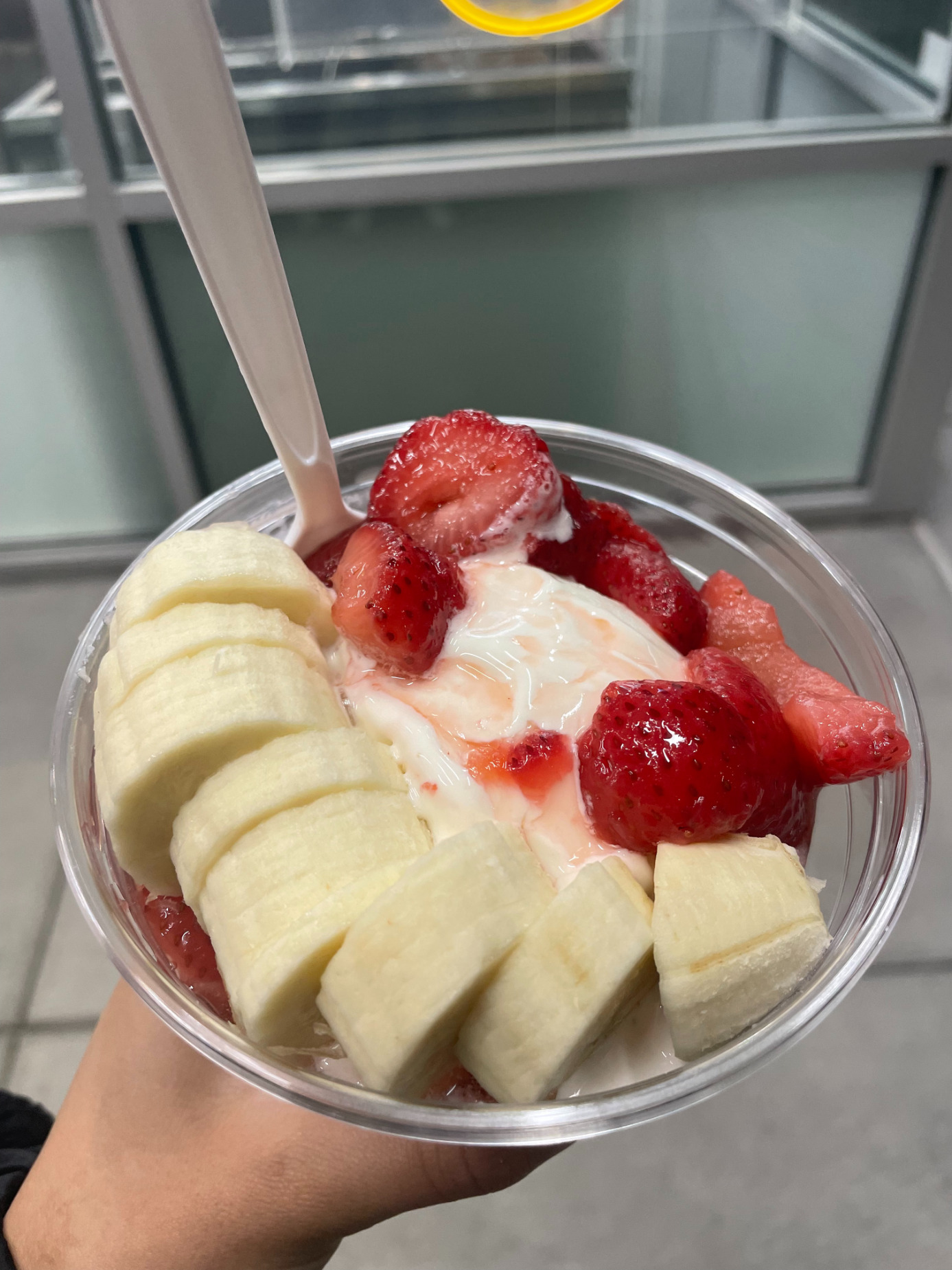 この右側のストロベリーとバナナが乗っているアイスがストロベリーアナサンデーです!この写真を撮った時、11月中旬ぐらいなのに何故か-1℃しかなくて、でも友達も私もアイスが食べたかったので買いに行きました。で。。その次の日から1週間風邪を引きました笑